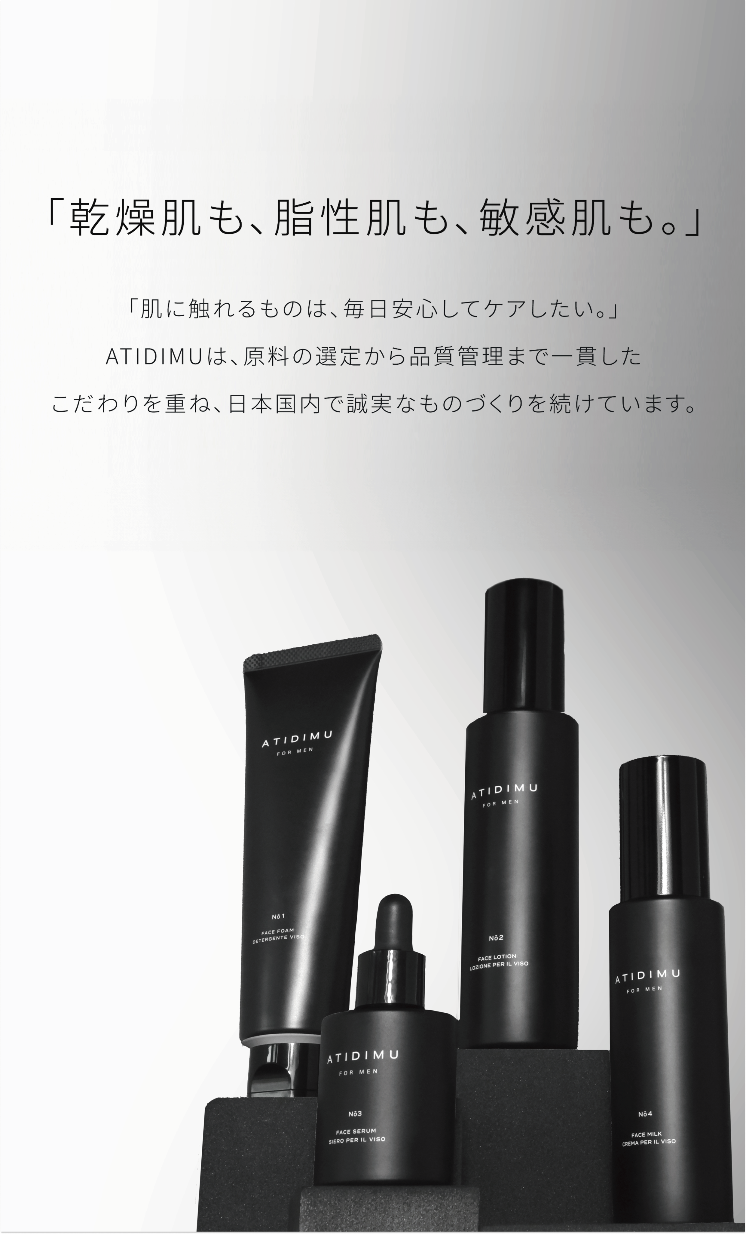 ベタつかず、しっとり。整う乳液。 「アティディム 乳液」は、皮脂と乾燥のバランスが崩れやすい男性の肌に向けた、日本製の高機能メンズ乳液です。 軽質シリコーンと植物由来オイルのバランス処方により、うるおいをしっかり閉じ込めつつも、塗布後はベタつかずさらりとした仕上がり。肌なじみが良く、朝晩どちらのケアにも快適にご使用いただけます。 整肌成分のレチノール誘導体(パルミチン酸レチノール)やトコフェロール(ビタミンE)、うるおいを補うBG・グリセリン、保護成分としてスクワランや水添レシチンなどを配合。肌のキメを整え、清潔感のある印象へ導きます。 香りはシリーズ共通の天然精油(シトラスハーブ調)による爽やかさ。ライン使いでも違和感なく調和し、毎日のスキンケアを快適な習慣に。 ※すべての方に刺激が起こらないわけではありません。 特徴と成分のポイント レチノール誘導体(パルミチン酸レチノール):年齢に応じた肌のコンディションをケア スクワラン・ジメチコン・シクロペンタシロキサン:軽質な保護膜で乾燥をブロック BG・グリセリン・ペンチレングリコール:うるおいを角層まで補給し、バランスの整った肌へ 水添レシチン・キサンタンガム:なめらかで肌負担の少ないテクスチャーを実現天然精油ブレンドの香り:ライン使いに最適なシトラスハーブ調の香り こんな方におすすめ 化粧水のあと、乾燥が気になる方 ベタつかない乳液を探している方 スキンケア後も清潔感を保ちたい方 敏感肌や脂性肌でも使いやすい乳液を求める方 日常使いしやすい香り控えめの乳液をお探しの方